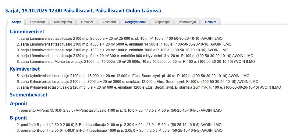 Useamman vuoden jälkeen Kajaanissa järjestetään paikallisravit! Paikallisravit ovat matalan kynnyksen ravitoimintaa, niissä ei ole totoraveihin vaadittavaa koelähtöä oltava voimassa. Mikäli vaadittava aikarajoitus alitetaan, saa hevonen samalla kilpailuoikeuden voimaan. Paikallisraveissa onkin hyvä hakea rutiinia sekä varmuutta nuorille hevosille, ja tietenkin oivallinen mahdollisuus vauhtikestävyystreeniin jo kilpaileville hevosille ja poneille. Voittajat palkitaan kaulanauhalla & ruusukkeella, lisäksi kaikkien osallistujien…
