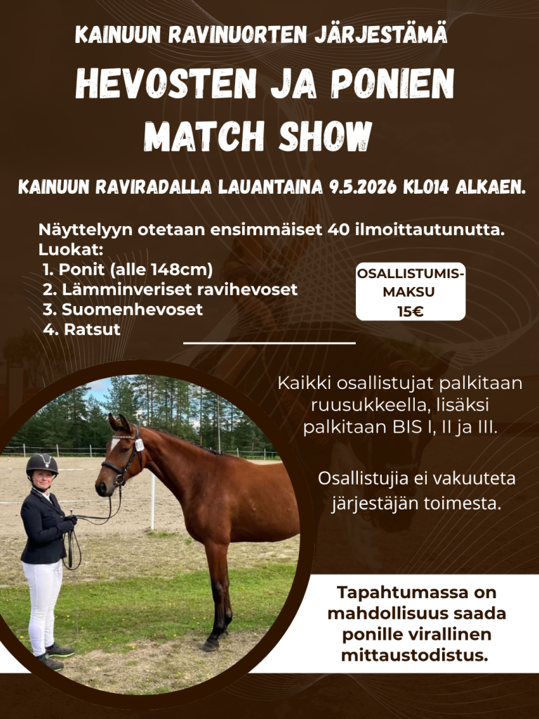 19.10.2025 ravattiin Kainuun raviradalla paikallisravit vuosien tauon jälkeen, joihin ilmoitettiin upeat 61 osallistujaa! Raveissa kuvaamassa oli Kristiina Kasila, kuvia voi tiedustella kookuvat@gmail.com Tapahtuman mahdollisti:JK Metal Service OyKajaanin AutomaalaritKTH-M Leppänen OyKama AutokorjaamoKauneushoitola Riitta KaukonenTilipalvelu Able OyMoottori&Vaihteisto Manninen OyBLESI-tuoteTraktoriurakointi Antti HaatajaMaanrakennus MAP-kone OyRinne-talliFL-talli Mukana myös:Kontinjoen HerkkukulmaKylmän RatsastustalliPrisman ravintolamaailmaK-market PaltamoPro Riders Kainuu
